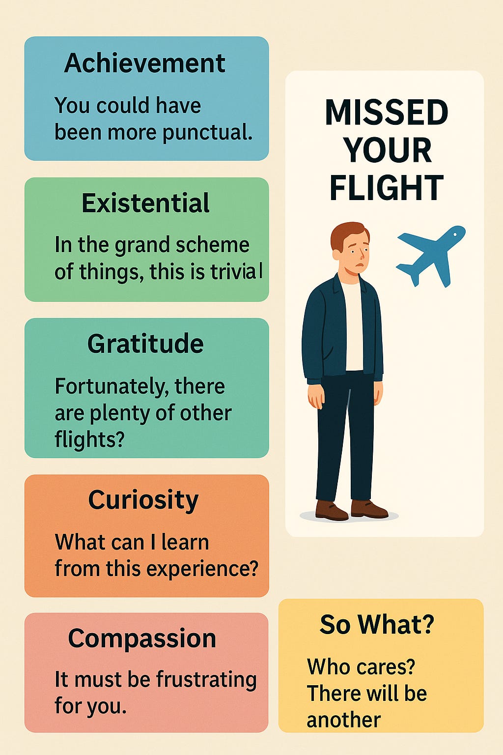 You could also take the elevator to the Compassion floor where you don’t argue with any of your thoughts. You just empathize with the feeling and say, “It is what it is. I don’t feel great about it right now but I’ll give it time.”
