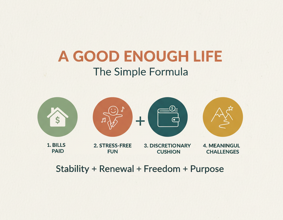 A Good Enough Life - Bills paid (for stability) + Stress-free fun (for renewal) + Discretionary cushion (for freedom) + Meaningful challenge (for purpose)